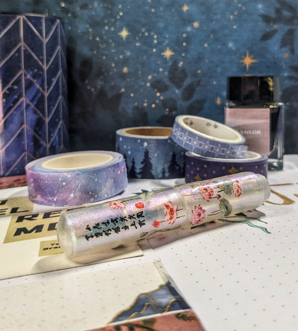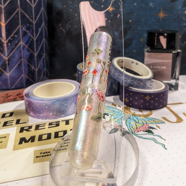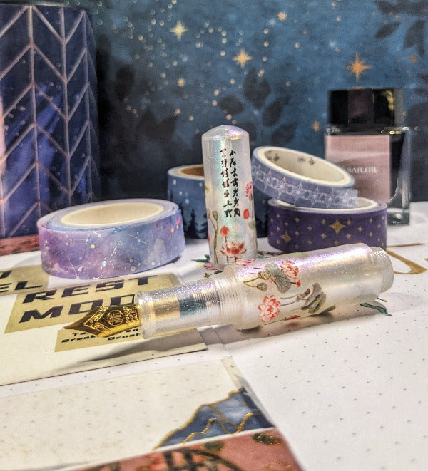 Lotus flowers have a long history in art. Often symbolizing purity, rebirth or rising above the primordial muck, they've become one of my favorite flowers and symbols. They surround this eyedropper fountain pen giving the appearance of a tiny lotus pond in your hands. The pen has a blue-green shimmer that is absolutely stunning in the light.